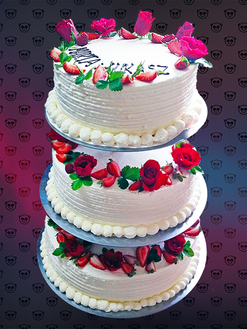 Tort zrobiony jest z bitej śmietanny, a dekoracja wykonana jest z czerwonych owoców i kwiatów.
